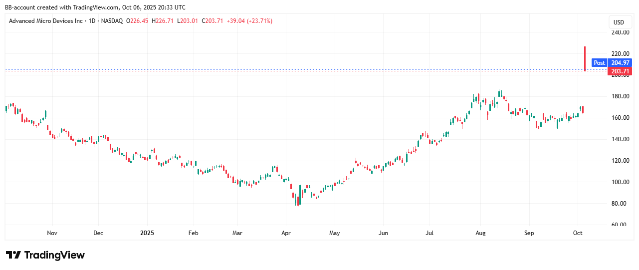 AMD’s aandeel steeg met 23,7% na de bekendmaking van de samenwerking met OpenAI. OpenAI zal tot 6 gigawatt aan Instinct-GPU’s inzetten, te beginnen met 1 gigawatt in 2026.