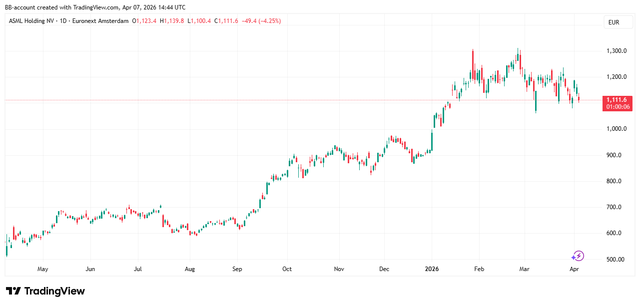 In de onderstaande grafiek zien we het koersverloop van ASML:
