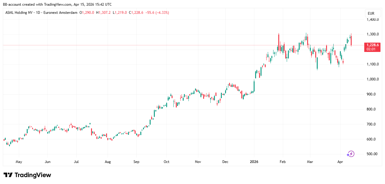 De groei wordt ondersteund door investeringen in AI-infrastructuur en uitbreiding van productiecapaciteit bij klanten. In de onderstaande grafiek zien we het koersverloop van ASML: