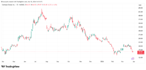 In de onderstaande grafiek zien we het koersverloop van Coinbase: