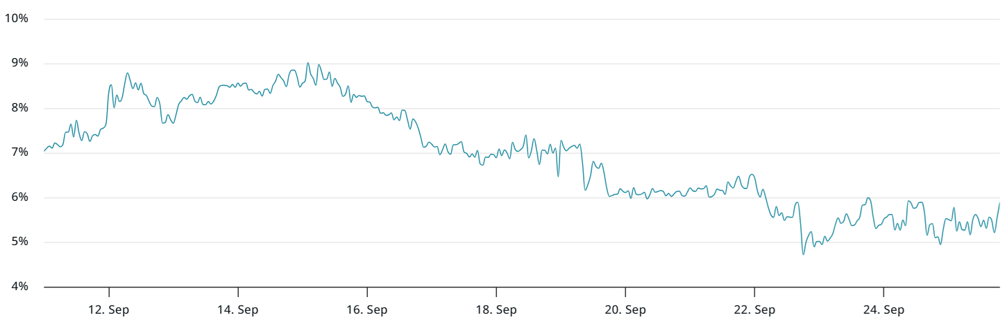 De twee maanden futures-premie van Bitcoin ten opzichte van de spotmarkten bleef stabiel op 5%, binnen de neutrale bandbreedte van 5% tot 10%: