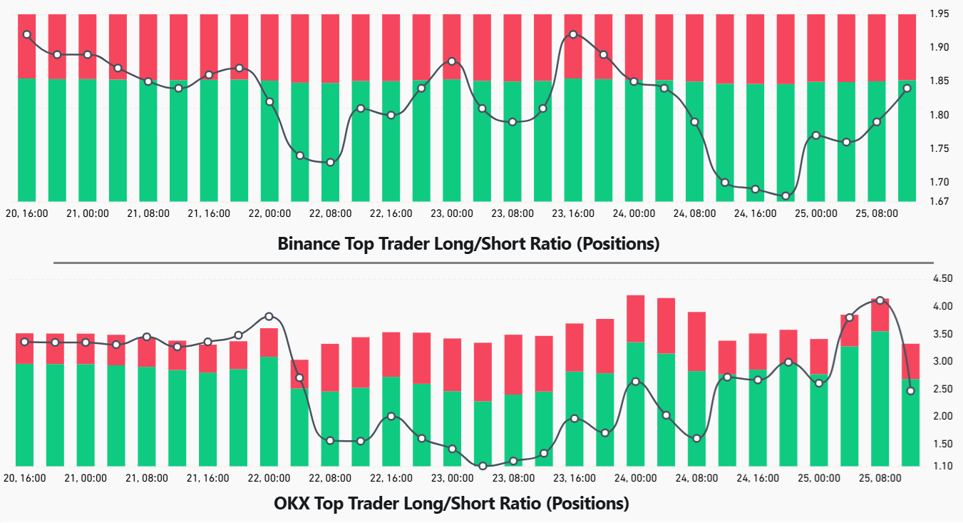 Top-traders op Binance verminderden longposities, waardoor de long-to-short ratio daalde naar 1,7x, het laagste niveau in meer dan 30 dagen. Toen Bitcoin onder $112.000 daalde, voegden zij langzaam weer longs toe, wat de ratio naar 1,9x bracht.