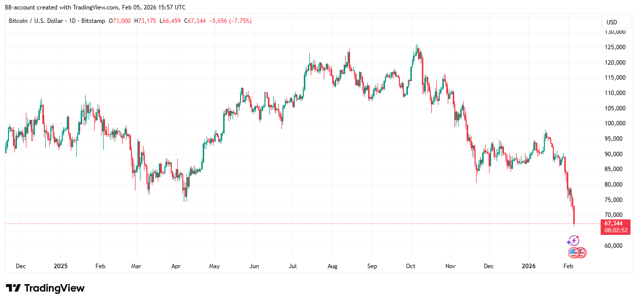 Bitcoin is donderdag onder de grens van 67.000 dollar gezakt en bereikte het laagste niveau sinds november 2024. De verkoopdruk neemt toe doordat beleggers twijfelen aan de rol van bitcoin als waardeopslag en inflatiebescherming. Ook afnemende institutionele vraag zet de koers verder onder druk.