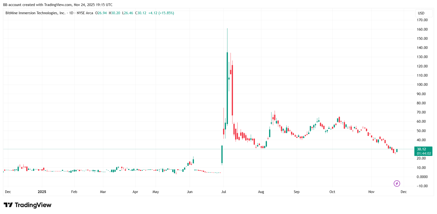 In de onderstaande grafiek zien we het koersverloop van BitMine: