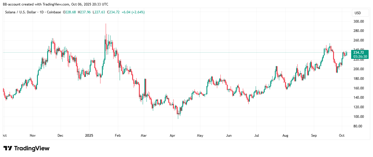In de onderstaande grafiek zien we het koersverloop van Solana: