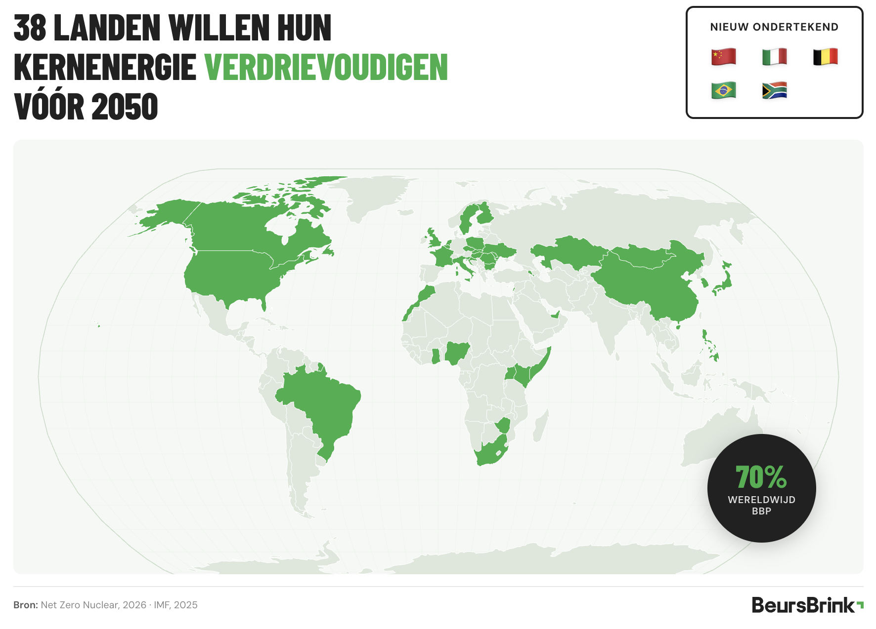 Parallel aan de regeringen hebben meer dan 140 bedrijven binnen de nucleaire toeleveringsketen zich aangesloten via de Net Zero Nuclear Industry Pledge. Namen als EDF, Westinghouse, Cameco en GE Hitachi. En 14 grote internationale financiële instellingen (BoFa, Goldman, Morgan Stanley) hebben hun steun uitgesproken, inmiddels al uitgegroeid naar 16. Niet als marketingpraatje, maar als signaal dat zij bereid zijn kapitaal te mobiliseren voor grootschalige kernenergieprojecten die voorheen moeilijk te financieren waren.