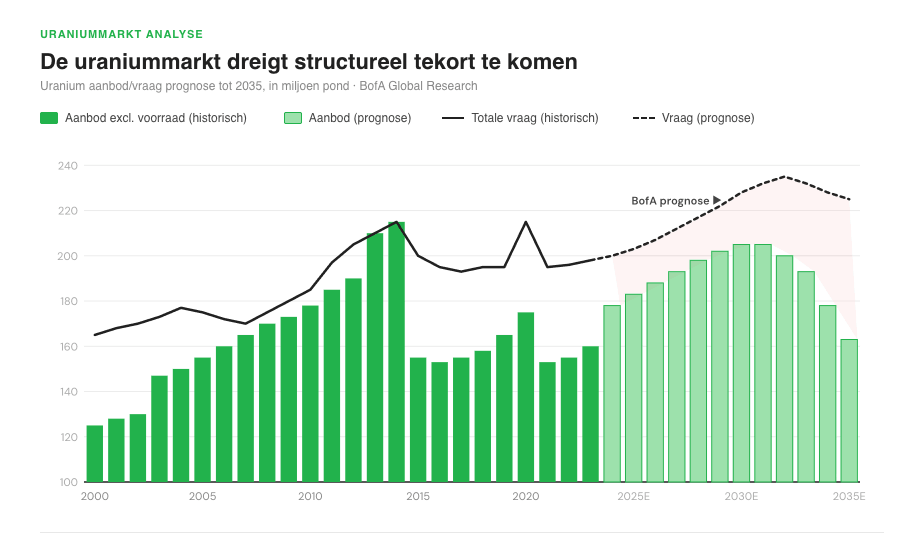 In 2025 produceert de wereld zo’n 176 miljoen pond uranium per jaar, terwijl de vraag 182 miljoen pond bedraagt. Dat is een jaarlijks tekort van 6 miljoen pond, en dat groeit. Tegen 2040 wordt de vraag op 400 miljoen pond geschat, meer dan dubbel het huidige niveau.