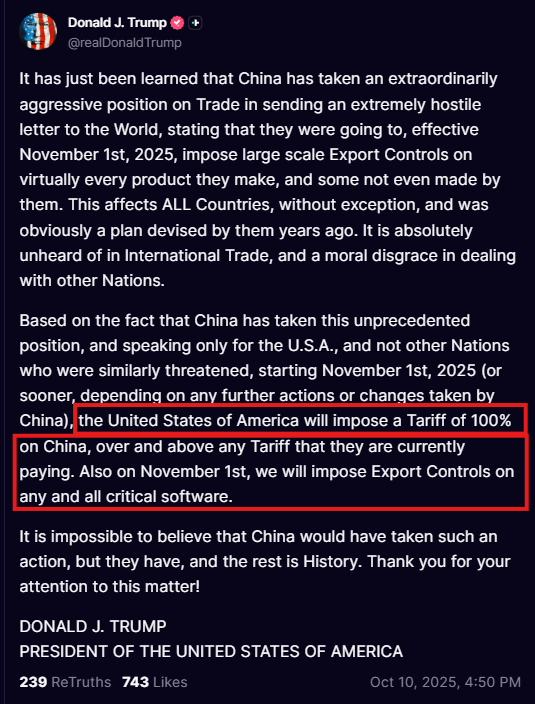 De volgende dag, rond 22:57 uur Nederlandse tijd, reageerde de Amerikaanse president Trump met de aankondiging van 100% importheffingen op Chinese goederen.