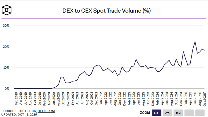 Dit collectieve falen zal de trend naar decentrale handelsplatformen – die opereren zonder tussenpersoon en vaak transparanter zijn – naar verwachting versnellen. Kortom, de ratio van DEX naar CEX, op de onderstaande grafiek, zal blijven stijgen. Dat is heel goed nieuws voor blockchains.