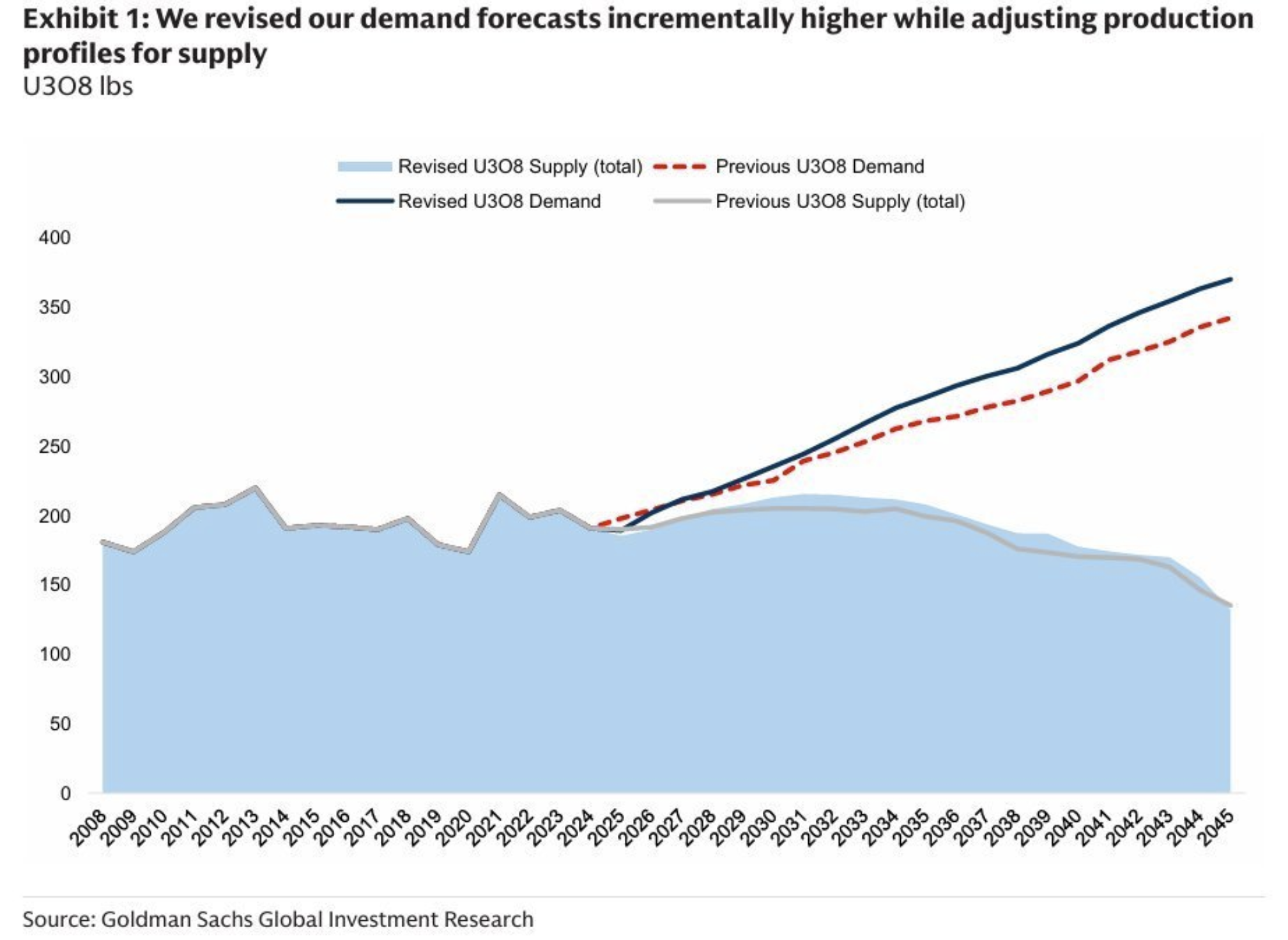 Deze grafieken van Goldman Sachs zijn de moeite waard om even te delen. De zakenbank heeft namelijk opnieuw (!) zijn verwachtingen voor uranium opwaarts bijgesteld. Er zijn drie grafieken van belang.