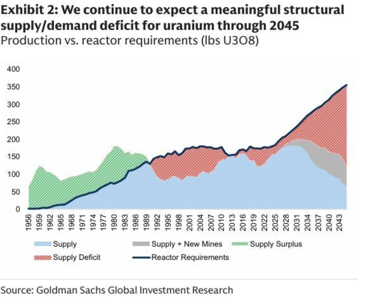 En dat is even los van de al bestaande reactoren. Goldman heeft heel mooi weergegeven hoe de vraag vanuit kernreactoren de uraniummarkt beinvloedt: