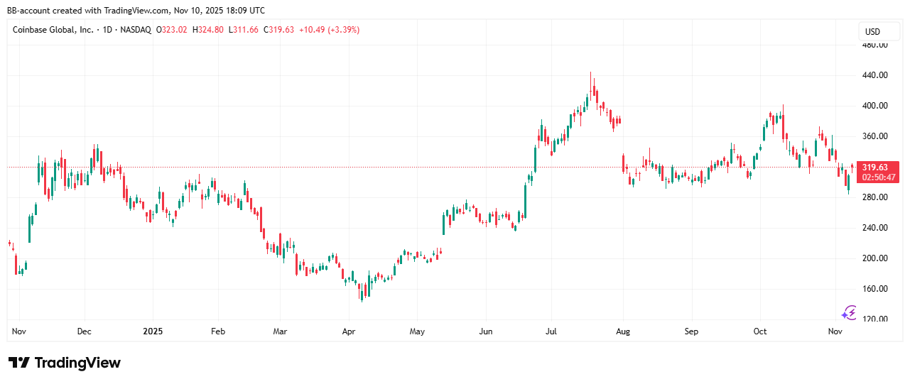 In de onderstaande grafiek zien we het koersverloop van Coinbase: