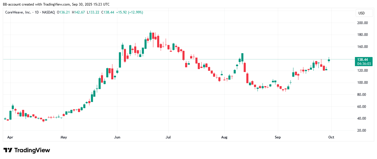 In de onderstaande grafiek zien we het koersverloop van CoreWeave: