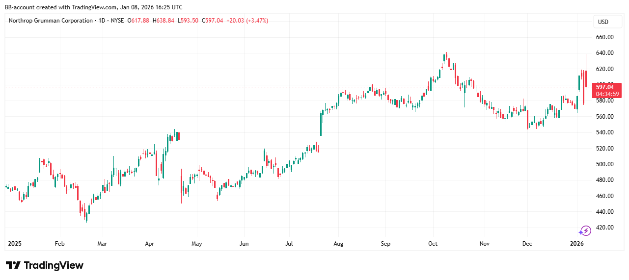 De voorgestelde begroting ligt fors boven eerdere niveaus en zorgde direct voor koersreacties. In de onderstaande grafiek zien we het koersverloop van Northrop grumman, dat volatiliteit liet zien na de oproep: