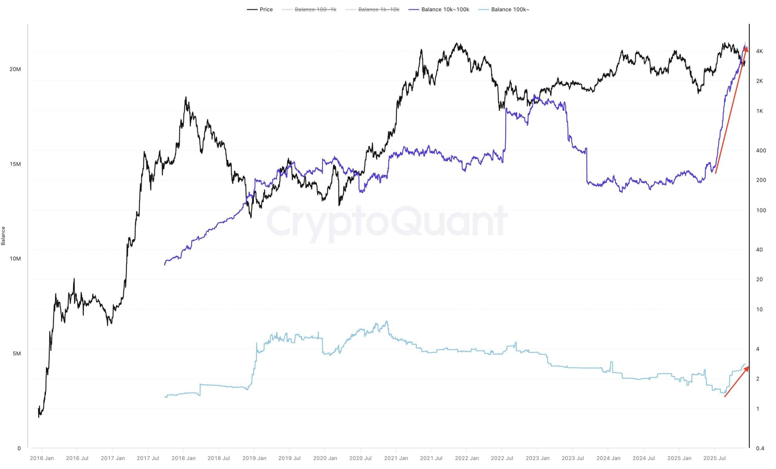 CryptoQuant meldt recordbalansen voor wallets met 10.000–100.000 ETH, wat de bullish trend versterkt:
