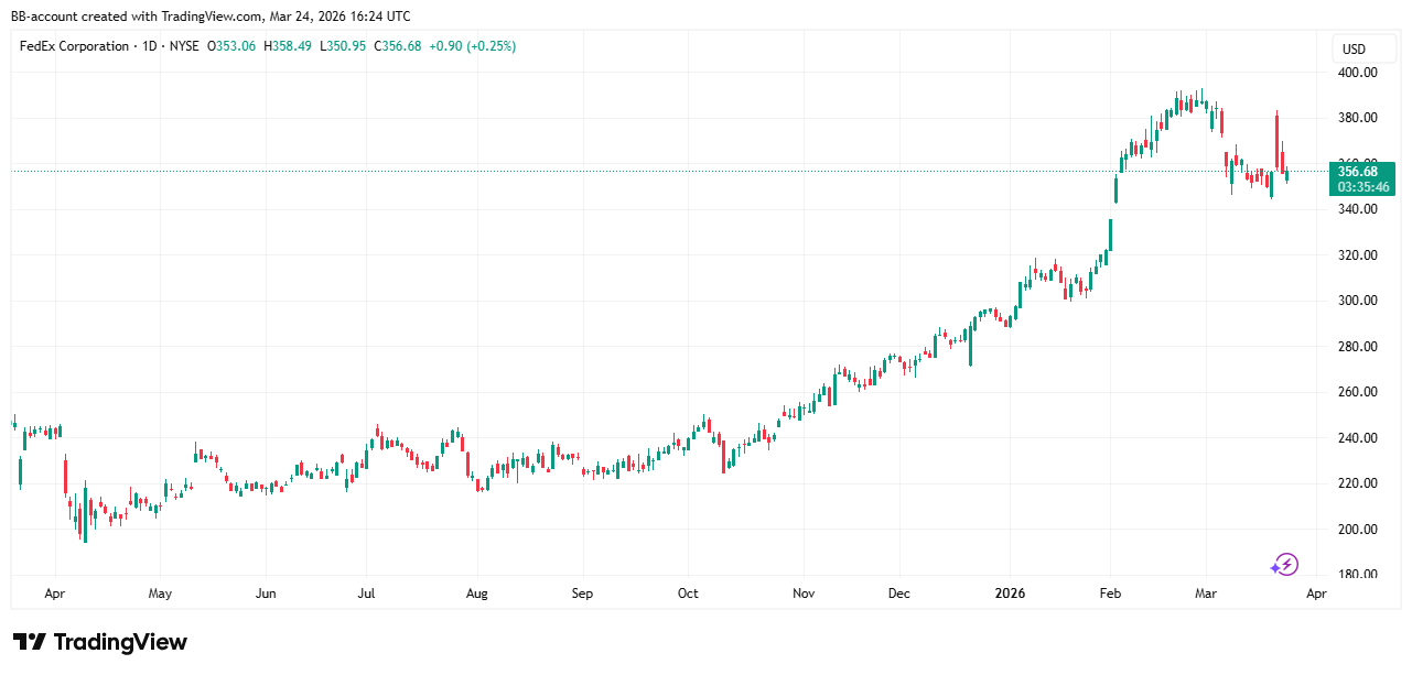 In de onderstaande grafiek zien we het koersverloop van FedEx: