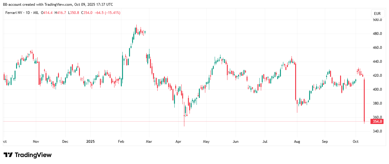 Ferrari zag zijn aandelen fors dalen na teleurstellende jaar- en 2030-verwachtingen, waarmee de Italiaanse sportwagenmaker op weg is naar de slechtste handelsdag ooit. Het bedrijf verlaagde ook zijn doel voor elektrische voertuigen en onthulde de technologie achter zijn eerste EV, de “elettrica”. De koersreactie weerspiegelt zowel de teleurstelling over de vooruitzichten als het marktsentiment rond Ferrari’s strategische keuzes.