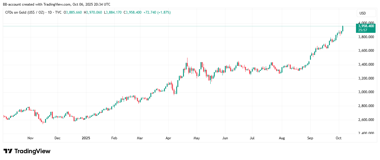 De goudprijs is dit jaar met bijna 50% gestegen tot een record van $3.940 per troy ounce, de sterkste stijging sinds 1979. Grote institutionele beleggers kopen massaal goud uit angst om rendement te missen en vanwege zorgen over inflatie en de verzwakkende dollar. Deze “gold-plated FOMO” heeft geleid tot recordinstromen in goudfondsen en een herwaardering van goud als beleggingscategorie.