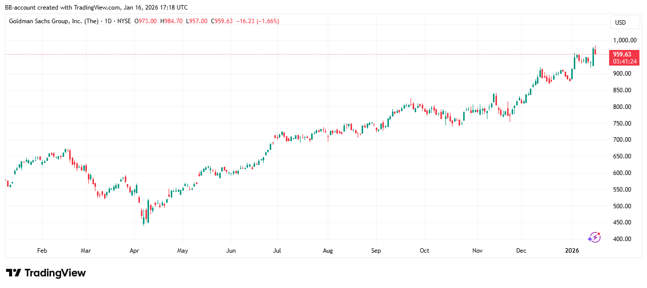 In de onderstaande grafiek zien we het koersverloop van Goldman Sachs: