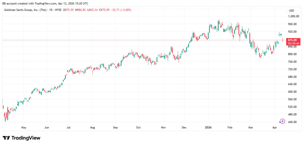 De combinatie van sterke handelsresultaten en zwakkere prestaties in andere divisies zorgt voor een gemengd beeld. In de onderstaande grafiek zien we het koersverloop van Goldman sachs: