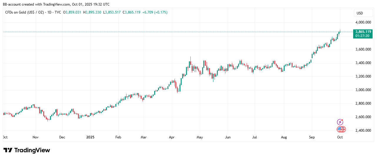 De goudprijs steeg naar een nieuw record boven $3.800 per ounce, nadat de Amerikaanse overheidssluiting beleggers richting veilige havens dreef. Door het stilvallen van belangrijke economische data en oplopende geopolitieke spanningen verliezen risicovolle beleggingen terrein. Analisten verwachten dat goud zelfs de grens van $4.000 kan doorbreken.