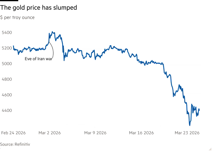 In de eerste dagen van het conflict bleef goud stabiel, terwijl aandelen en obligaties daalden. Daarna werd het edelmetaal meegesleurd in de bredere marktonrust.
