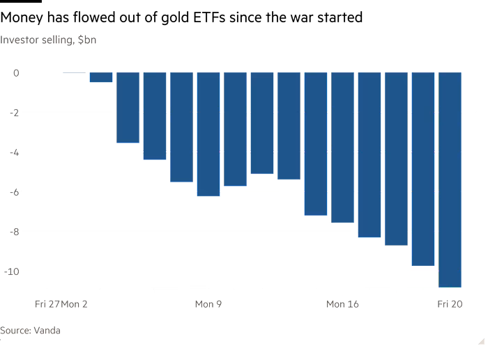 Volgens Vanda Research stroomde sinds het begin van de oorlog circa $10,8 miljard uit goud-ETF’s.