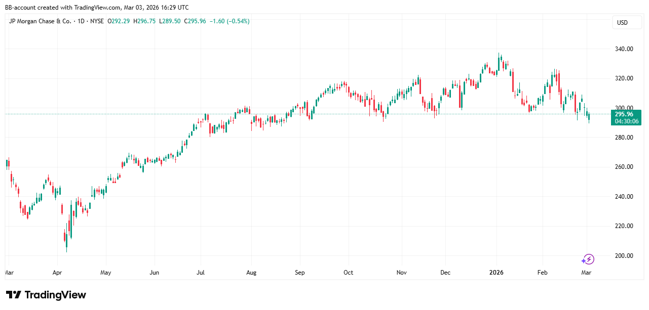 In de onderstaande grafiek zien we het koersverloop van JPMorgan: