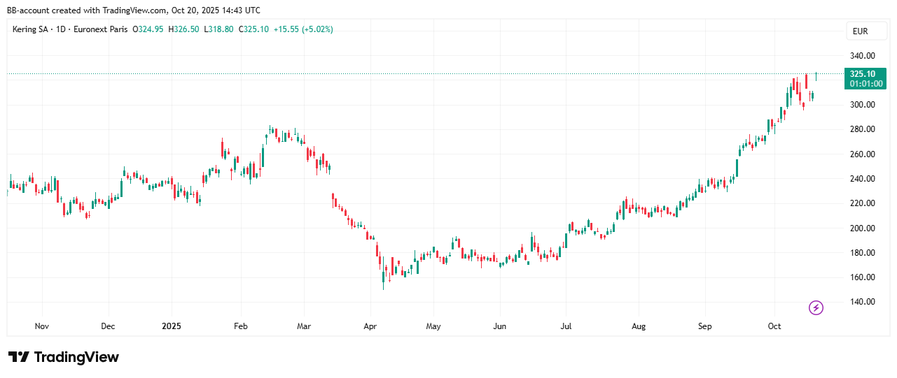 In de onderstaande grafiek zien we het koersverloop van Kering: