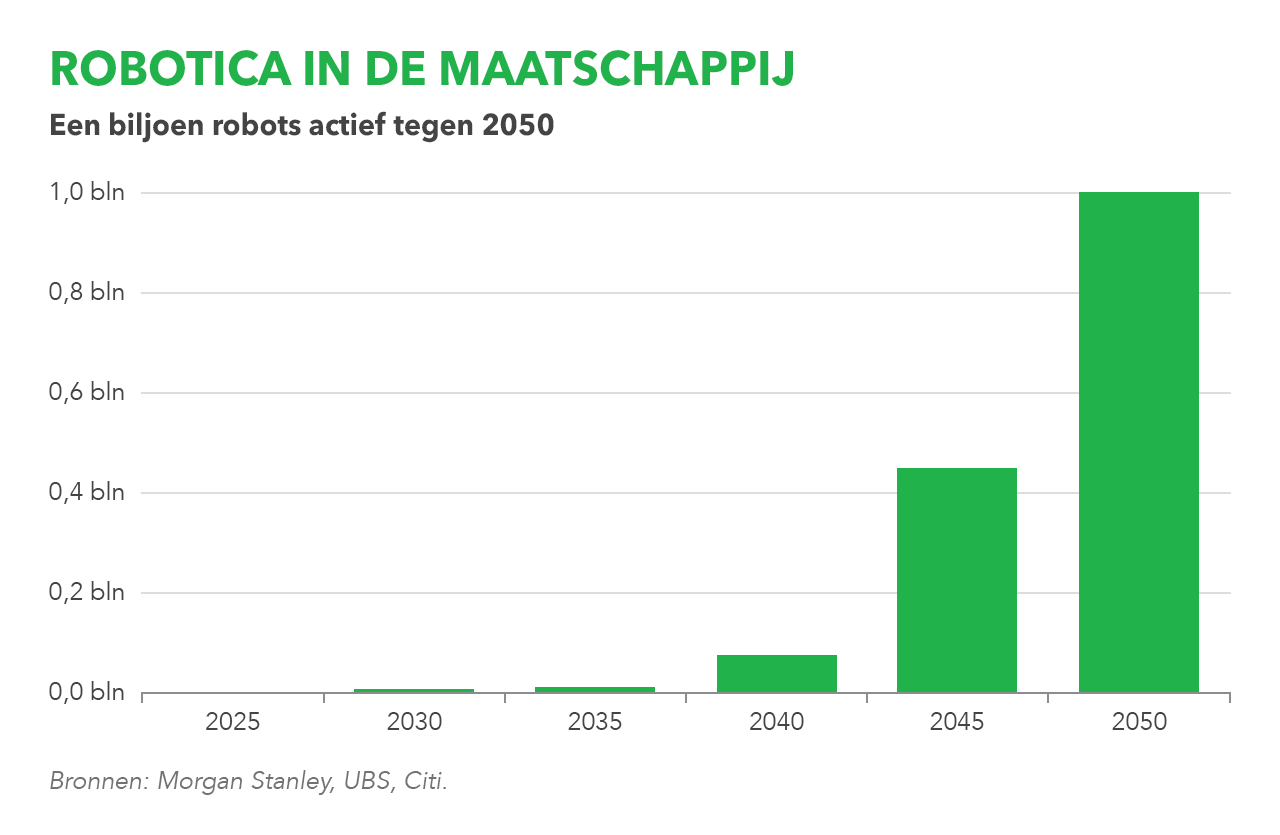 Analisten van Morgan Stanley noemen deze ontwikkeling ook wel de nieuwe Industriële Revolutie en verwachten 25 biljoen aan gecombineerde robotica-omzet en economische waarde tegen 2050.