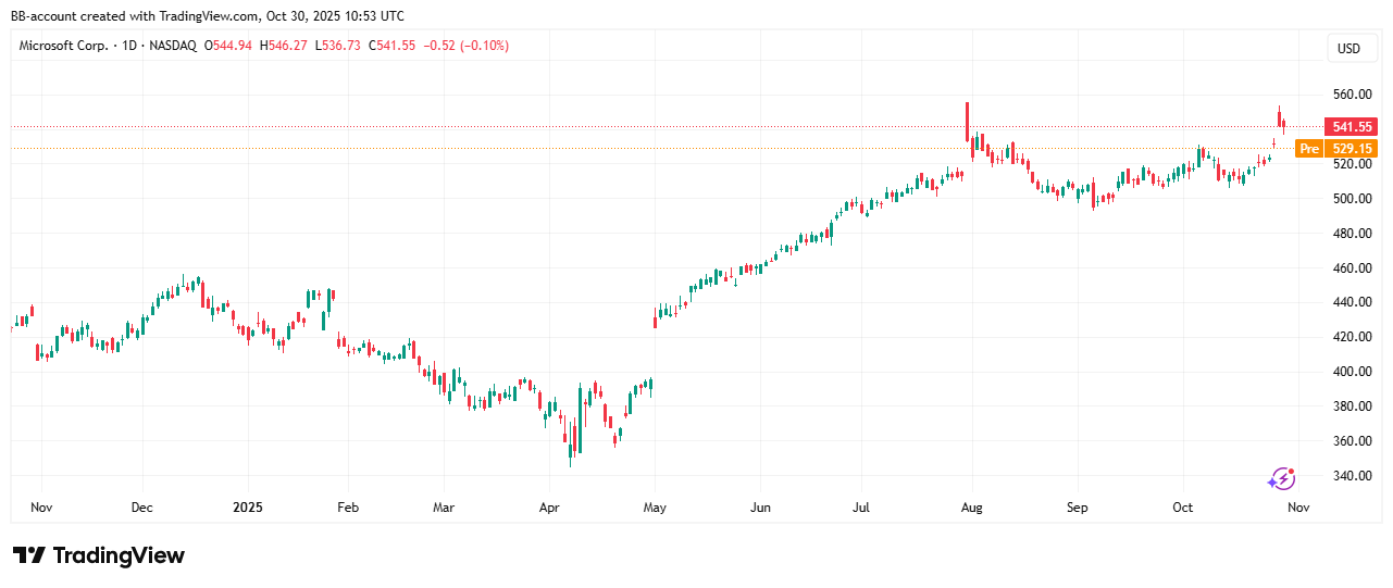 In de onderstaande grafiek zien we het koersverloop van Microsoft: