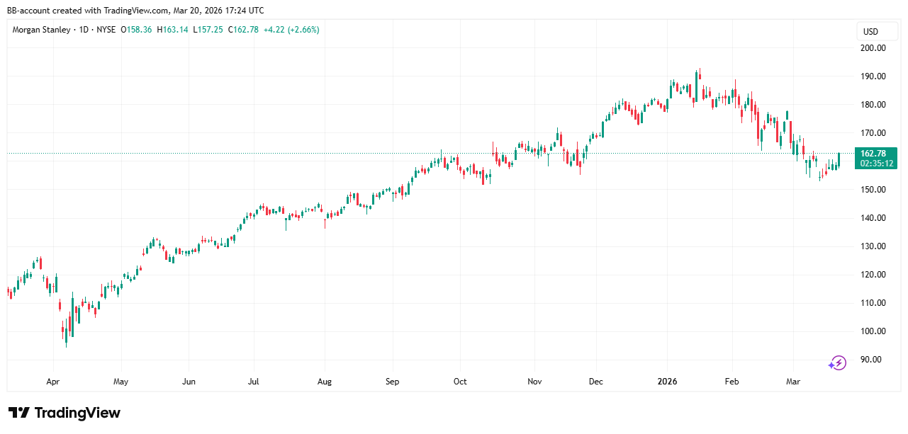 In de onderstaande grafiek zien we het koersverloop van Morgan Stanley: