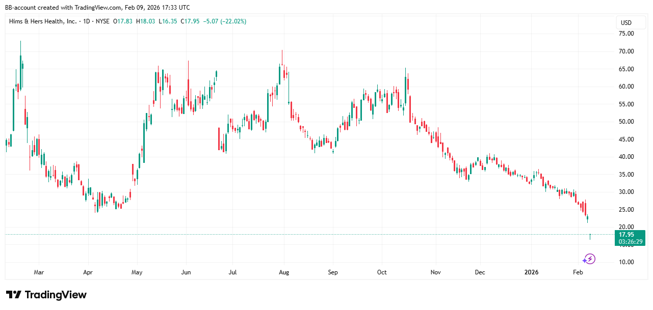 In de onderstaande grafiek zien we het koersverloop van Hims & hers, dat meer dan 20% kelderde: