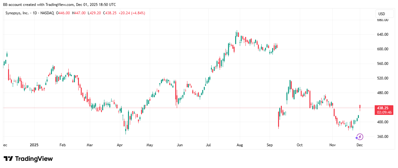 In de onderstaande grafiek zien we het koersverloop van Synopsys: