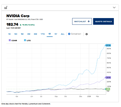 In de onderstaande grafiek zijn de koersstijgingen van zowel Lumentum en Coherent weergegeven vergeleken met die van Nvidia: