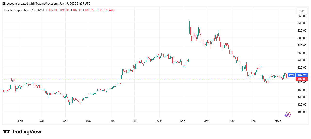 In de onderstaande grafiek zien we het koersverloop van Oracle: