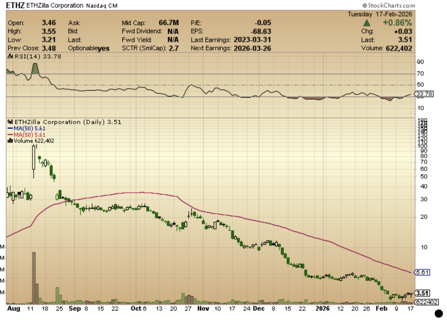 ETHZilla was voorheen een biotechbedrijf (180 Life Sciences) en maakte in 2025 een scherpe pivot: in plaats van medicijnen ontwikkelen ging het bedrijf grootschalig Ether (ETH) aankopen en positioneerde het zich als publieke ‘Ethereum treasury-speler’. In de zomer haalde het bedrijf honderden miljoenen op via een private placement om die strategie te financieren.