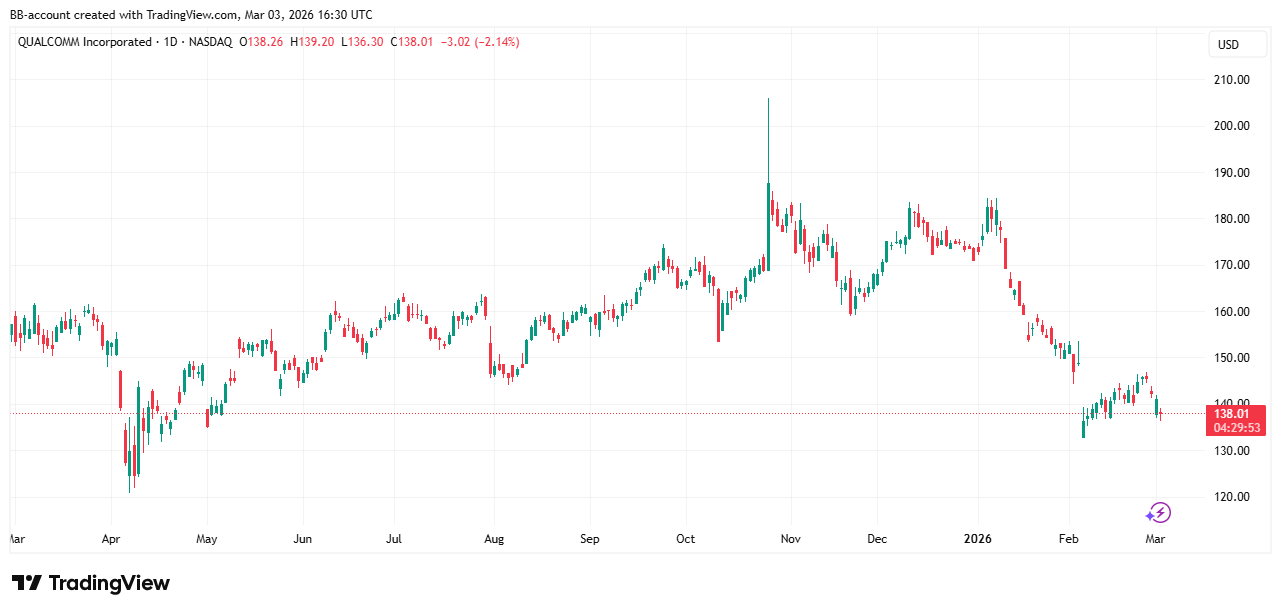 In de onderstaande grafiek zien we het koersverloop van Qualcomm: