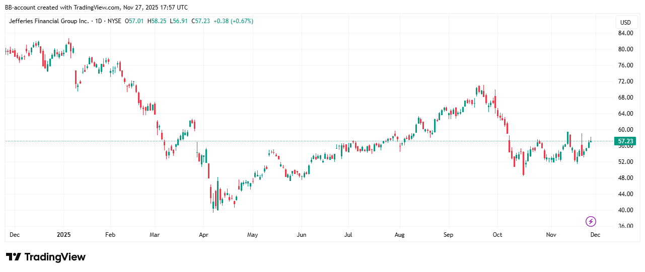 In de onderstaande grafiek zien we het koersverloop van Jefferies: