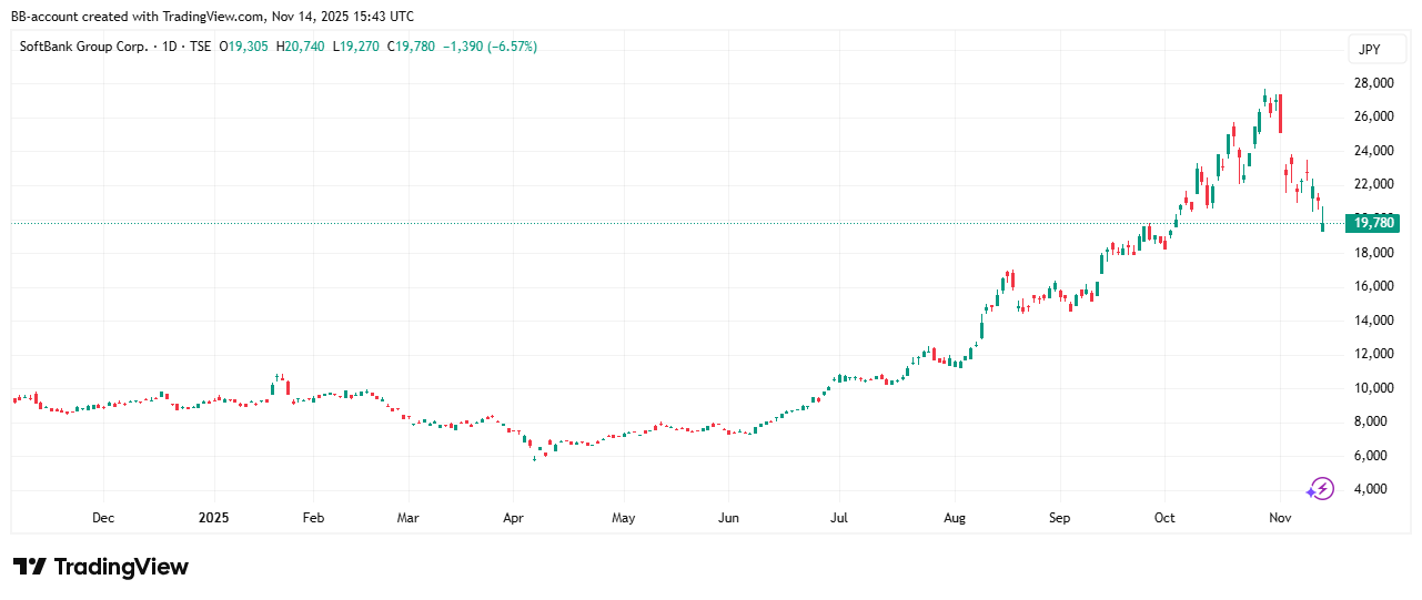De aandelen van SoftBank daalden vrijdag bijna 9% na drie dagen verliezen, na de verkoop van hun volledige Nvidia-belang van 5,83 miljard dollar. Ook andere technologieaandelen wereldwijd kwamen onder druk door zorgen over de AI- en chipmarkt. De koersdaling weerspiegelt zowel SoftBank’s portefeuilleaanpassingen als bredere marktsentimenten in de technologiesector.