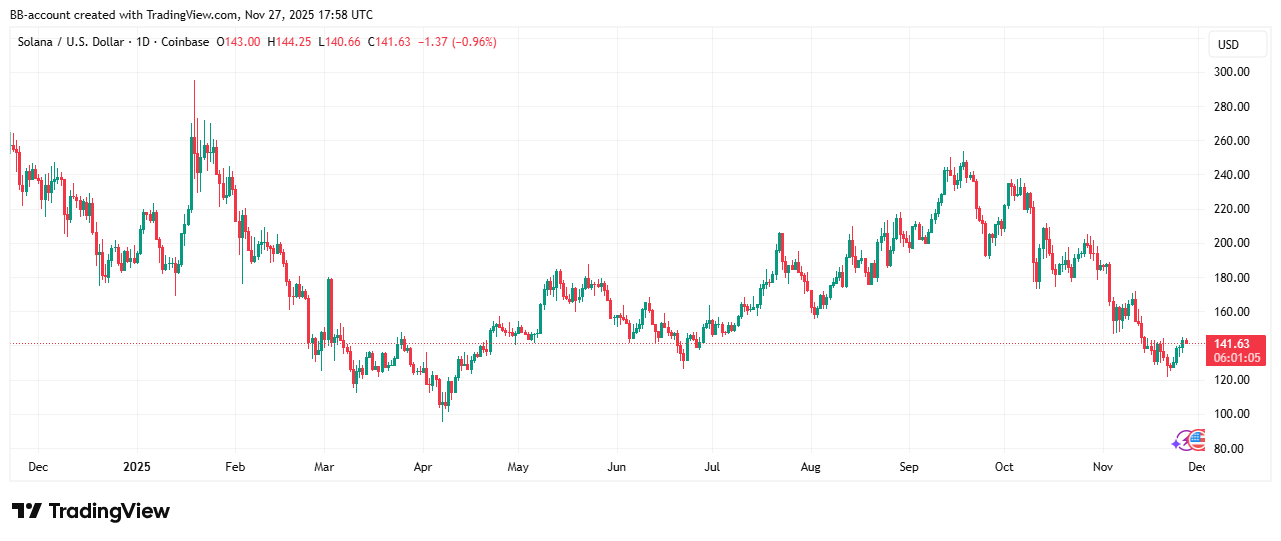 Solana’s TVL daalde deze maand met 20% en ligt 32% lager dan het hoogtepunt in september van $13,23 miljard. Ook netwerkfees namen de afgelopen zeven dagen met 16% af, wat wijst op verminderde netwerkvraag.