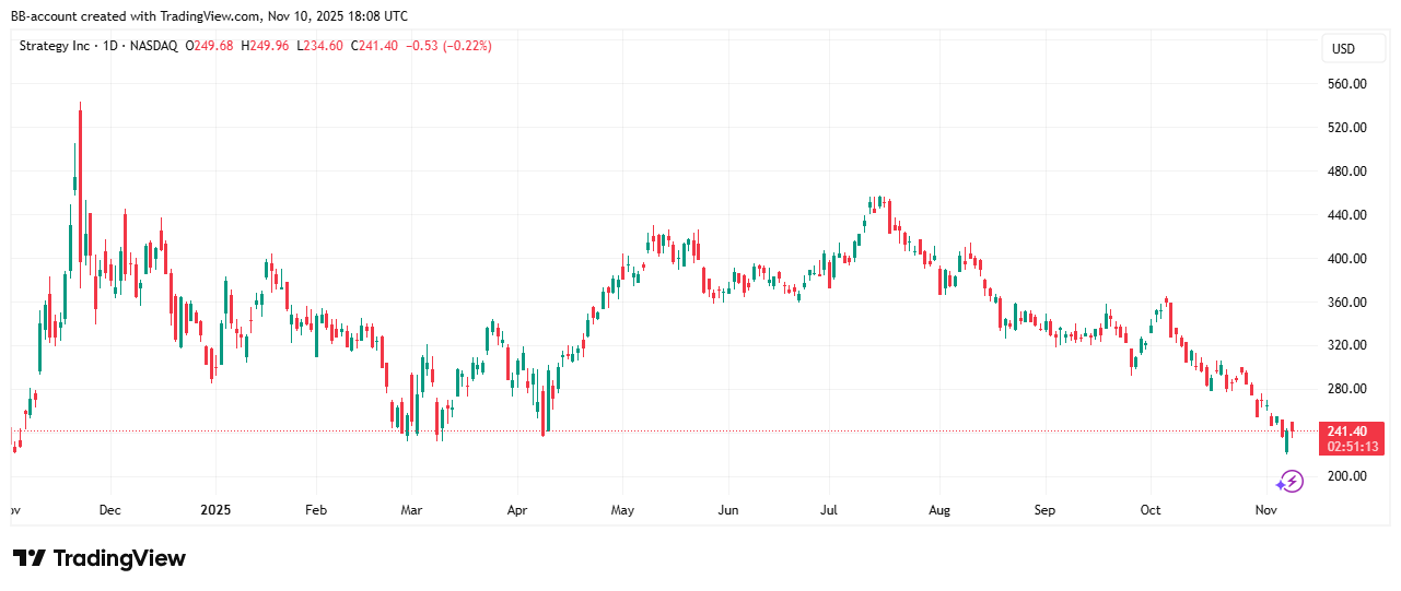 In de onderstaande grafiek zien we het koersverloop van Strategy:
