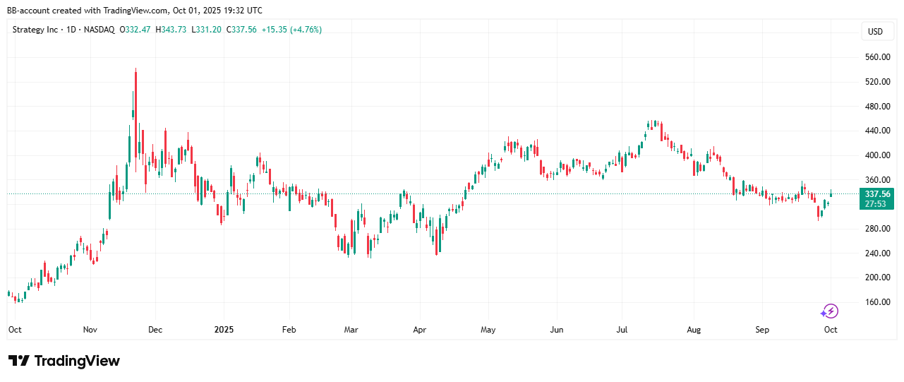 In de onderstaande grafiek zien we het koersverloop van Strategy: