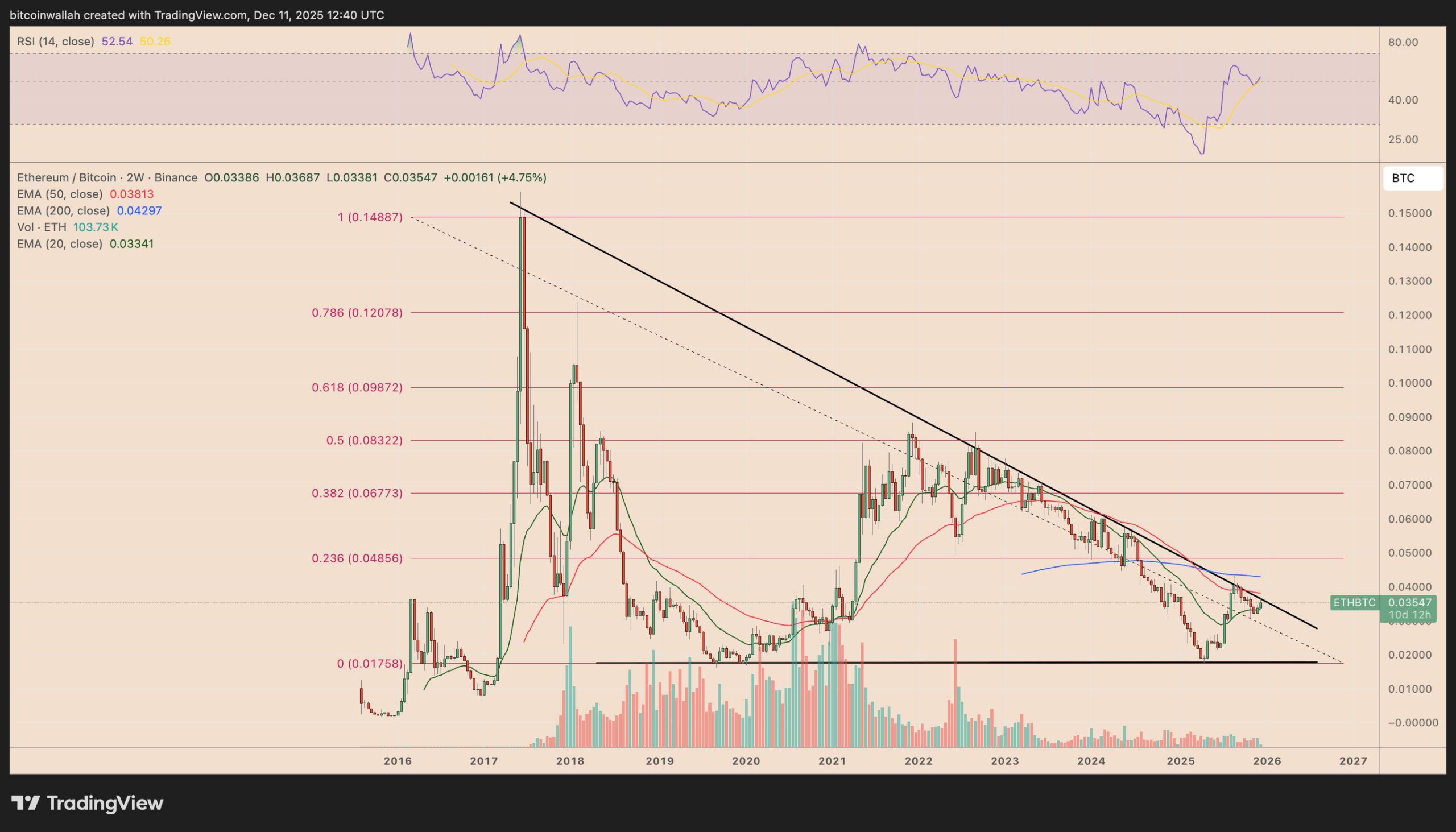 De Fibonacci-zone rond 0,059 BTC vormt een belangrijke weerstand. Als het patroon zich herhaalt, kan ETH/BTC deze fractal volgen richting het doel voor 2026.