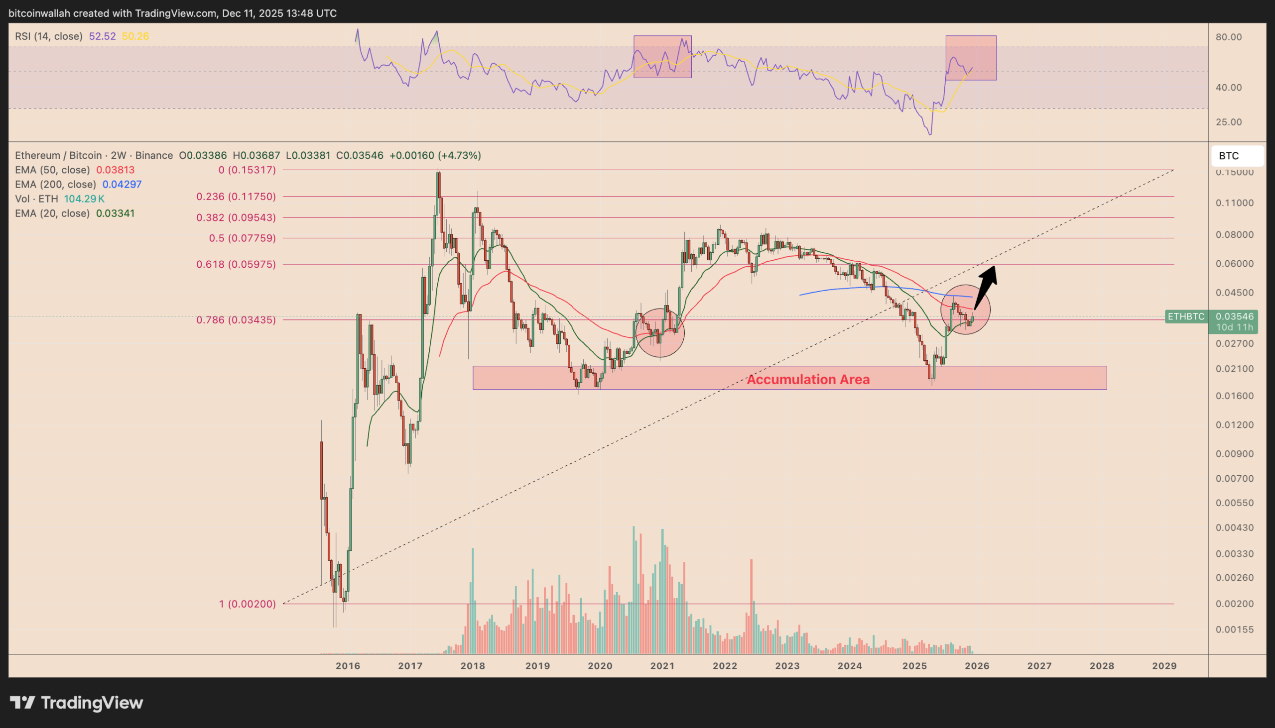 Een doorbraak boven deze neklijn kan de weg vrijmaken voor een stijging richting 0,063 BTC in 2026, een plus van 80% ten opzichte van huidige niveaus. De huidige rebound lijkt op de 2019-2020 accumulatieperiode, toen ETH bijna 450% steeg na een bodem rond 0,016–0,020 BTC.