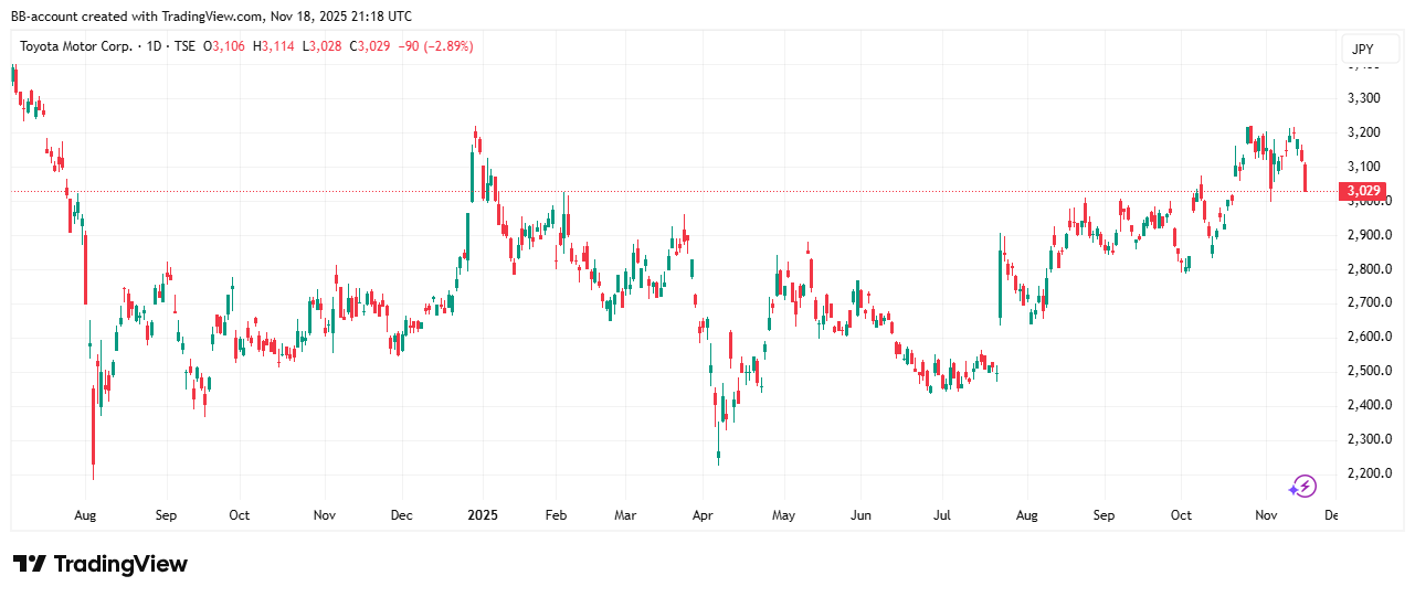 In de onderstaande grafiek zien we het koersverloop van Toyota, dat lager gleed: