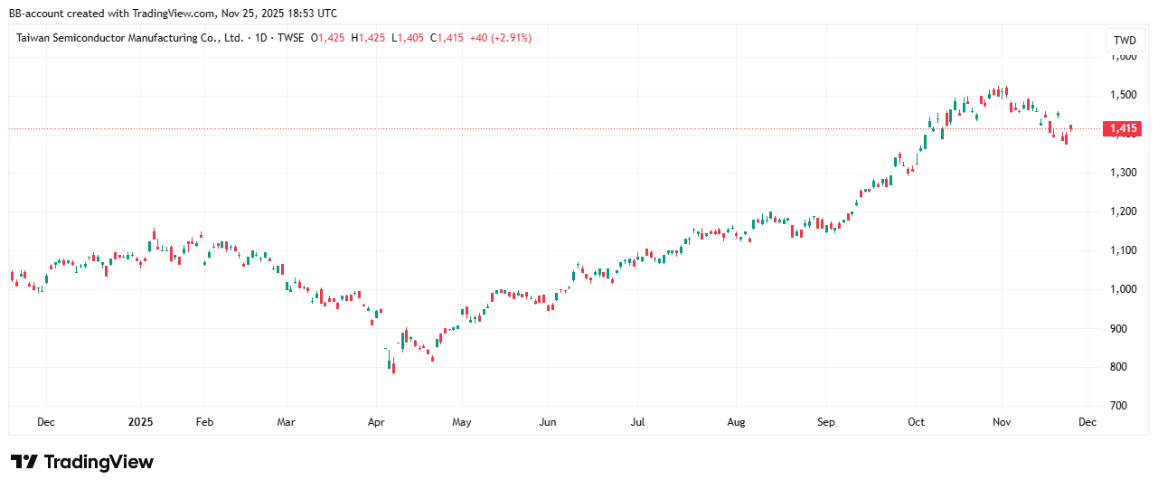 In de onderstaande grafiek zien we het koersverloop van TSMC: