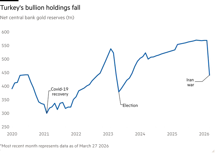 Central Bank of the Republic of Turkey heeft voor circa $20 miljard aan goud verkocht en uitgeleend sinds het uitbreken van de oorlog in Iran. Deze grootschalige transacties droegen bij aan de grootste maandelijkse prijsdaling van goud sinds 2008. De verkopen maken deel uit van inspanningen om de Turkse lira te ondersteunen en liquiditeit te waarborgen.