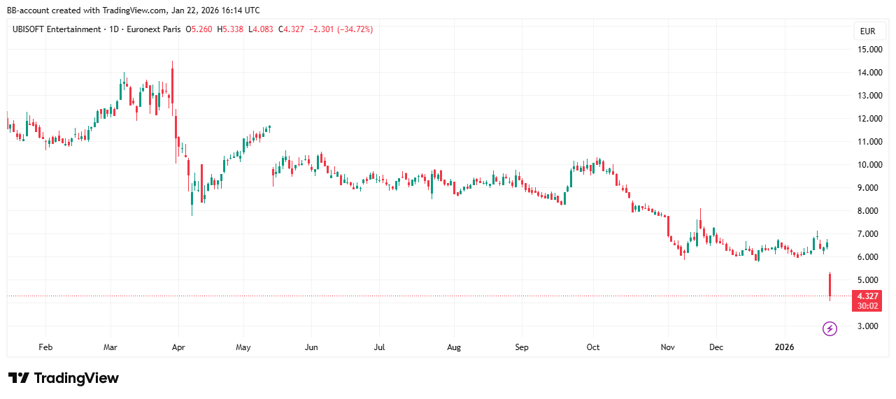 Aandelen Ubisoft zijn hard onderuit gegaan nadat de Franse gameontwikkelaar een ingrijpende reorganisatie aankondigde. Het bedrijf schrapt zes games, sluit meerdere studio’s en verwacht een fors operationeel verlies in boekjaar 2026. De maatregelen volgen op jaren van tegenvallende prestaties na de pandemie.