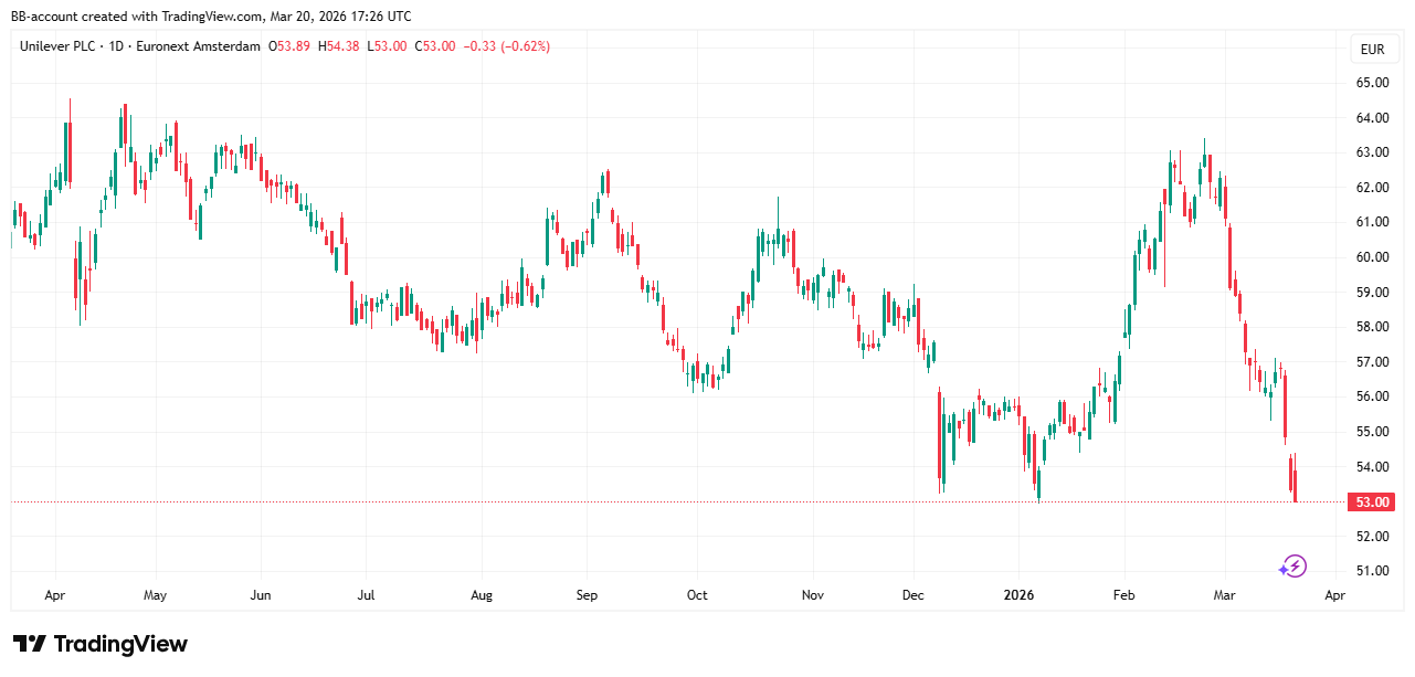 De divisie omvat bekende merken zoals Marmite en Hellmann’s en wordt door analisten hoog gewaardeerd. In de onderstaande grafiek zien we het koersverloop van Unilever:
